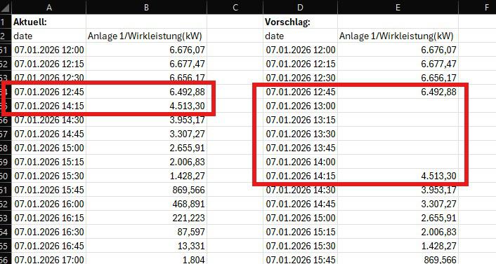 Beim Datenexport sollte es möglich sein, einen durchgehenden Zeitstempel in festen Intervallen (z. B. alle 15 Minuten) auszuwählen, unabhängig davon, ob für jeden Zeitpunkt ein Messwert vorliegt:
